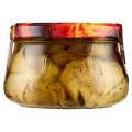 Questi carciofini vengono grigliati su brace viva, un processo artigianale che conferisce loro un sapore intenso e affumicato e una consistenza morbida ma compatta. Successivamente vengono conservati in un mix di olio di semi di girasole e olio extra vergine di oliva, arricchito con piante aromatiche e aceto di vino, che esalta il gusto mediterraneo del prodotto.